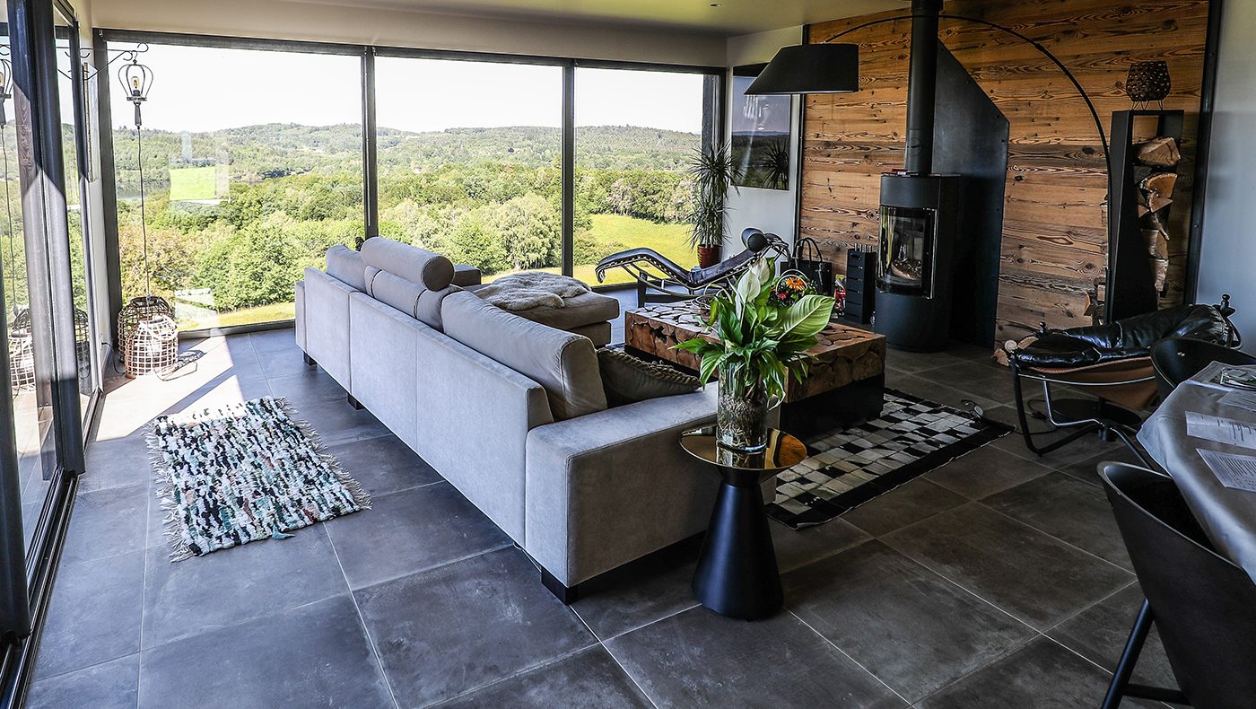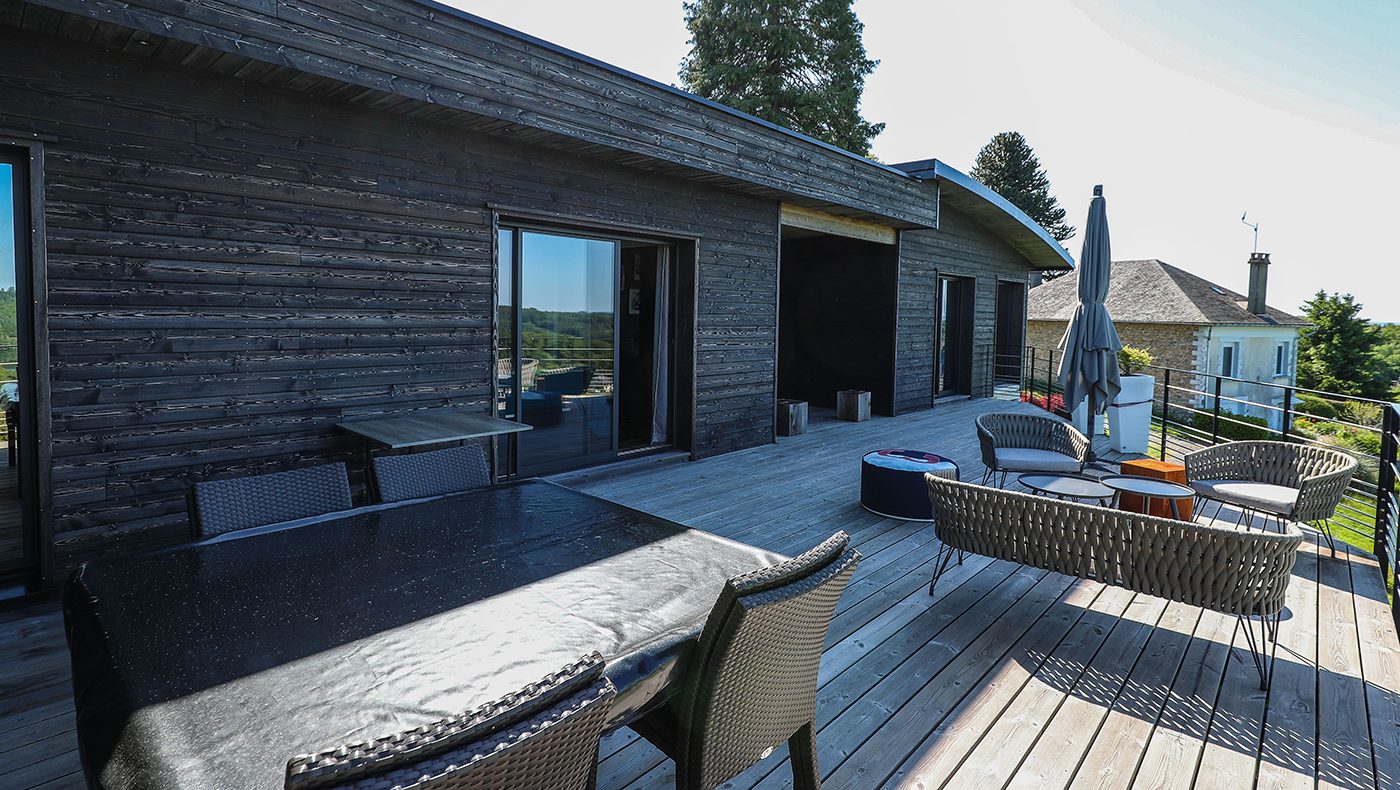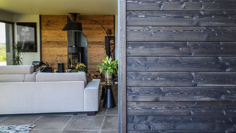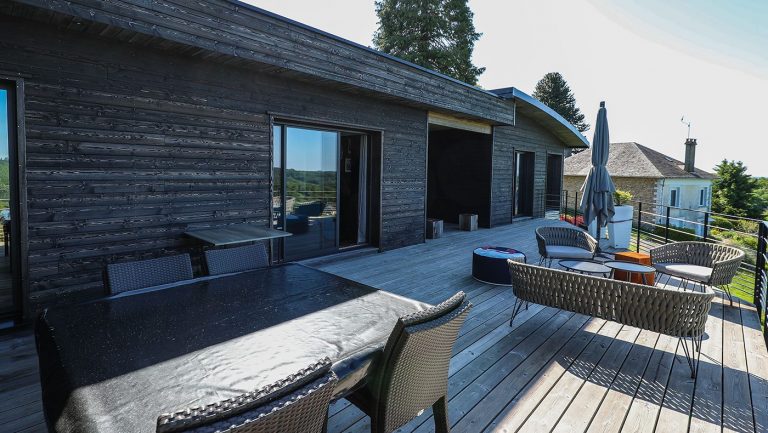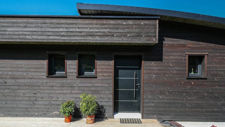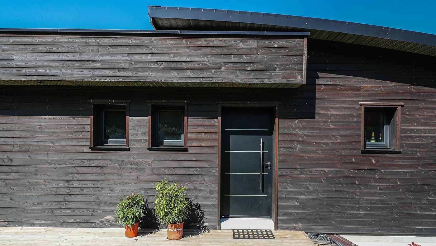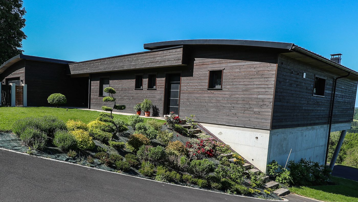 Pour sa maison à ossature bois, notre client a opté pour un bardage en bois de mélèze de teinte carbone. Cette couleur se marie parfaitement avec la toiture en bac acier cintrée sur les extrémités et plate sur la partie centrale de la maison. Une vue arborée imprenable, un apport solaire maximal en hiver, la performance thermique de l’ossature bois font de la maison un véritable havre de bien-être !