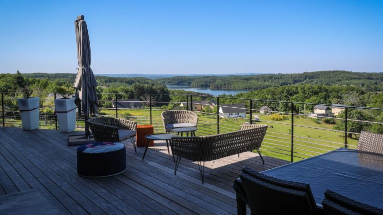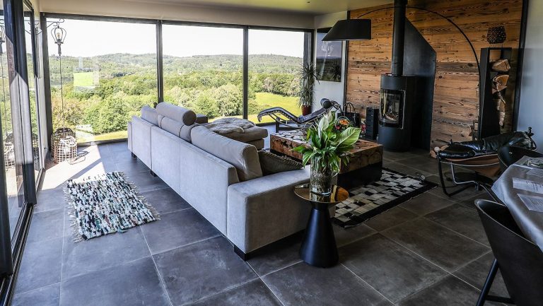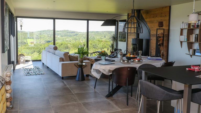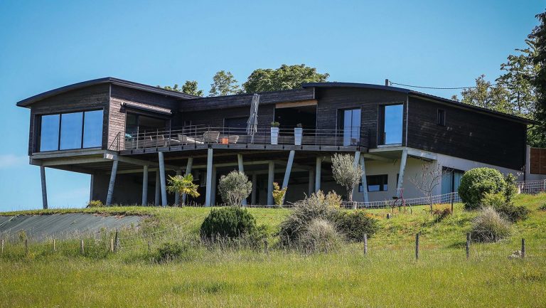Sur le terrain à très forte pente de notre client, la souplesse du procédé de construction ossature bois a permis de poser la maison à flanc de colline. Pour ce projet de construction neuve en bois, l’objectif pour notre client est aussi de profiter de la jolie vue sur la vallée. Soutenue par de fins pilotis en béton à l’allure déstructurée, la façade de la maison s’oriente plein sud sur un paysage naturel verdoyant. Selon les plans imaginés par notre client, cette habitation est conçue de manière à vivre dedans/dehors. Avec toutes les pièces aménagées au même niveau, la maison incite à un rapport privilégié avec l’environnement extérieur et la lumière naturelle. L’alternance de grandes baies vitrées fabriquées sur mesure en aluminium noir, tantôt fixes et tantôt ouvertes sur la vaste terrasse en bois de 77 m², offre une vue panoramique sur la nature à couper le souffle.