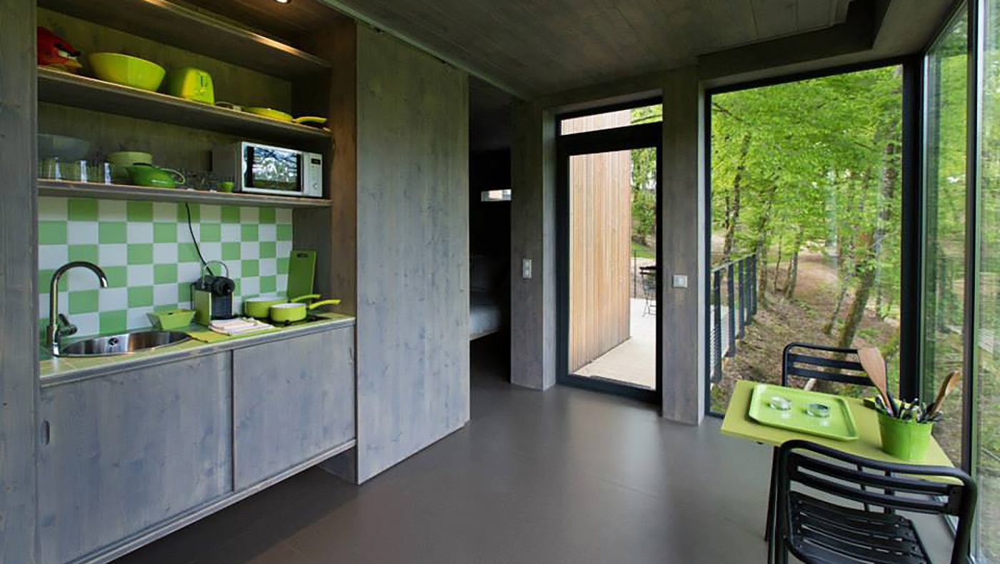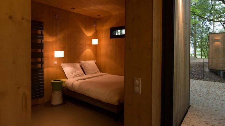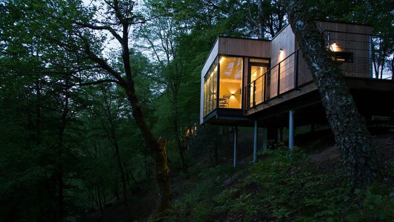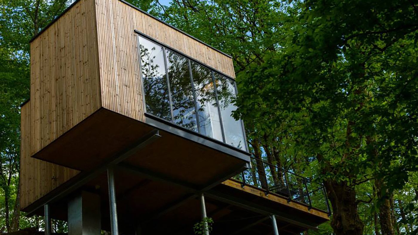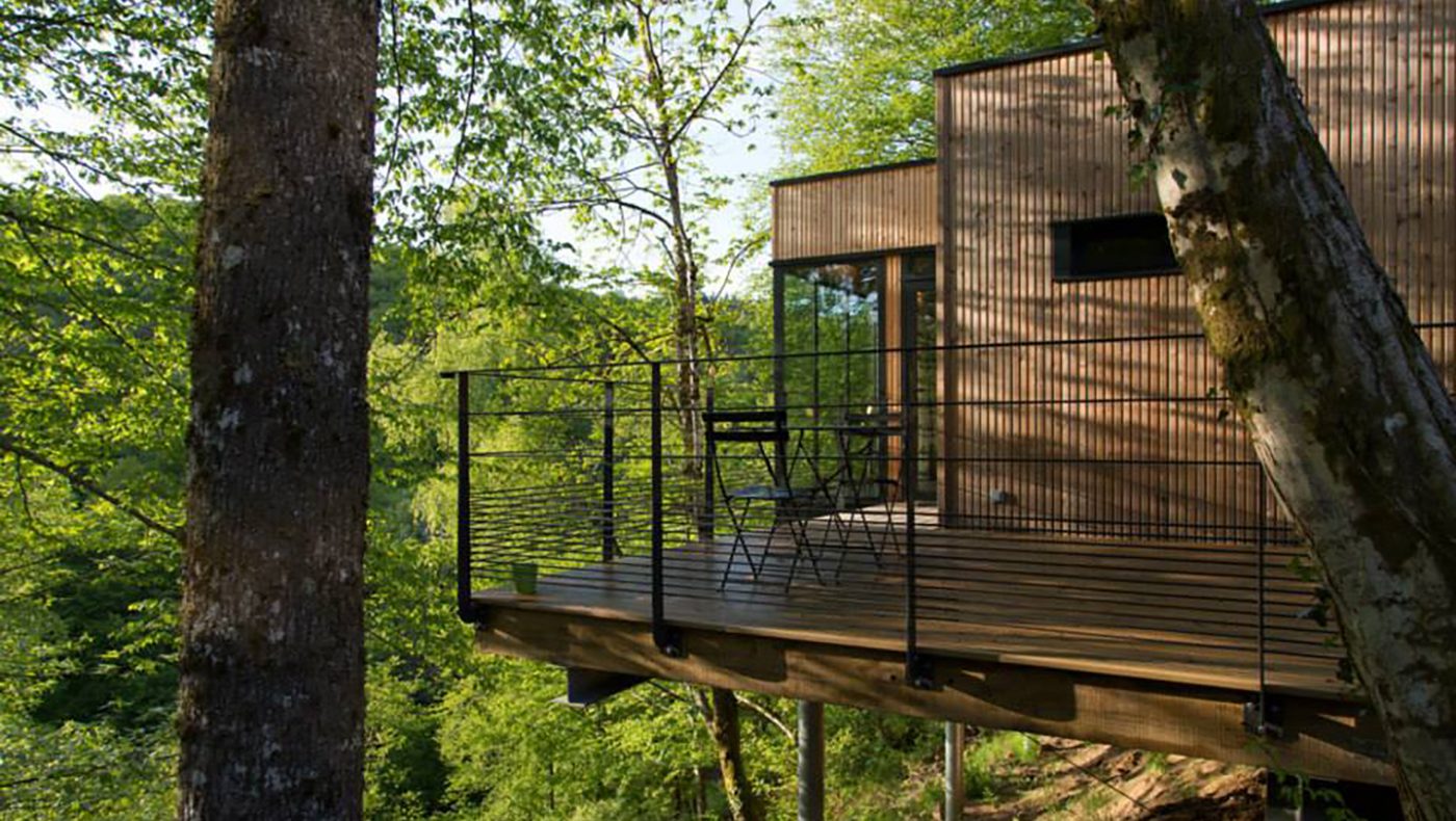 Pour le Domaine de Salagnac en Corrèze, nous avons construit six cabanes perchées dans les arbres avec terrasses selon les plans de l’architecte Apolline Terrier. Grâce à la technique écologique ossature bois, les habitats insolites d’environ 24 m² se fondent harmonieusement, sans se confondre, dans leur environnement boisé. Cette nouvelle approche de l’architecture en pleine nature respecte le site naturel du Domaine de Salagnac classé ZNIEFF (zone naturelle d’intérêt écologique, faunistique et floristique). La forme contemporaine légèrement anguleuse des hébergements de tourisme épouse le terrain. Le mélange des matières (bois, verre, métal), le bardage en bois de mélèze posé verticalement et les pilotis répondent naturellement aux arbres environnants. À l’intérieur des habitations, du bois encore ! Des panneaux de bois habillent les murs et les plafonds pour offrir une atmosphère chaleureuse et agréable à vivre. Un concept architectural aux lignes épurées dans un environnement naturel !