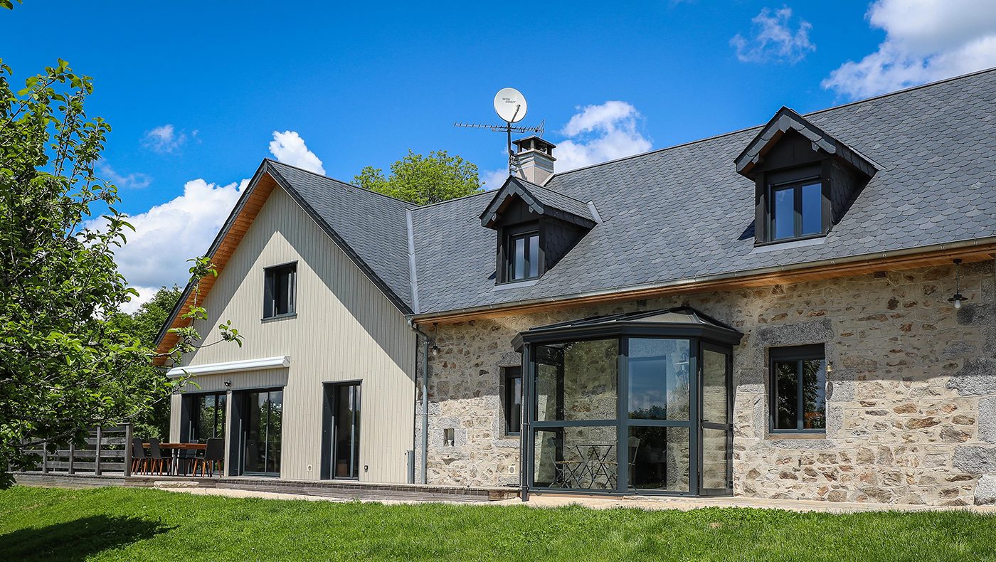 Direction le petit village de Courteix au nord d’Ussel en Corrèze où notre client vient d’acheter une maison en pierre de granit bleue qu’il souhaite rénover. En plus de la rénovation, il aimerait réaliser une extension collée à la construction existante. Il a déjà réalisé ses plans et a une idée très précise de ce qu’il souhaite pour l’extension en ossature bois de sa nouvelle habitation. Nous aimons particulièrement ce type de projet qui mêle rénovation et construction car il nous permet de mettre en œuvre une grande partie de nos savoir-faire.